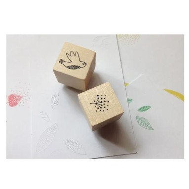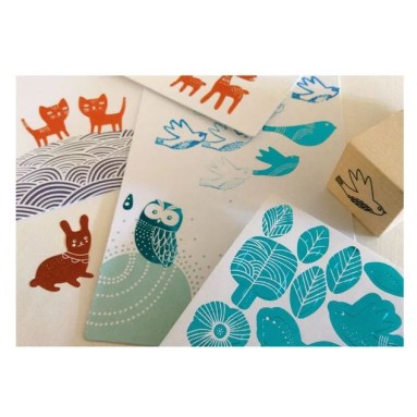 Una scatola con elementi che utilizzano diverse tecniche di stampa artigianale per realizzare bellissime cartoline.